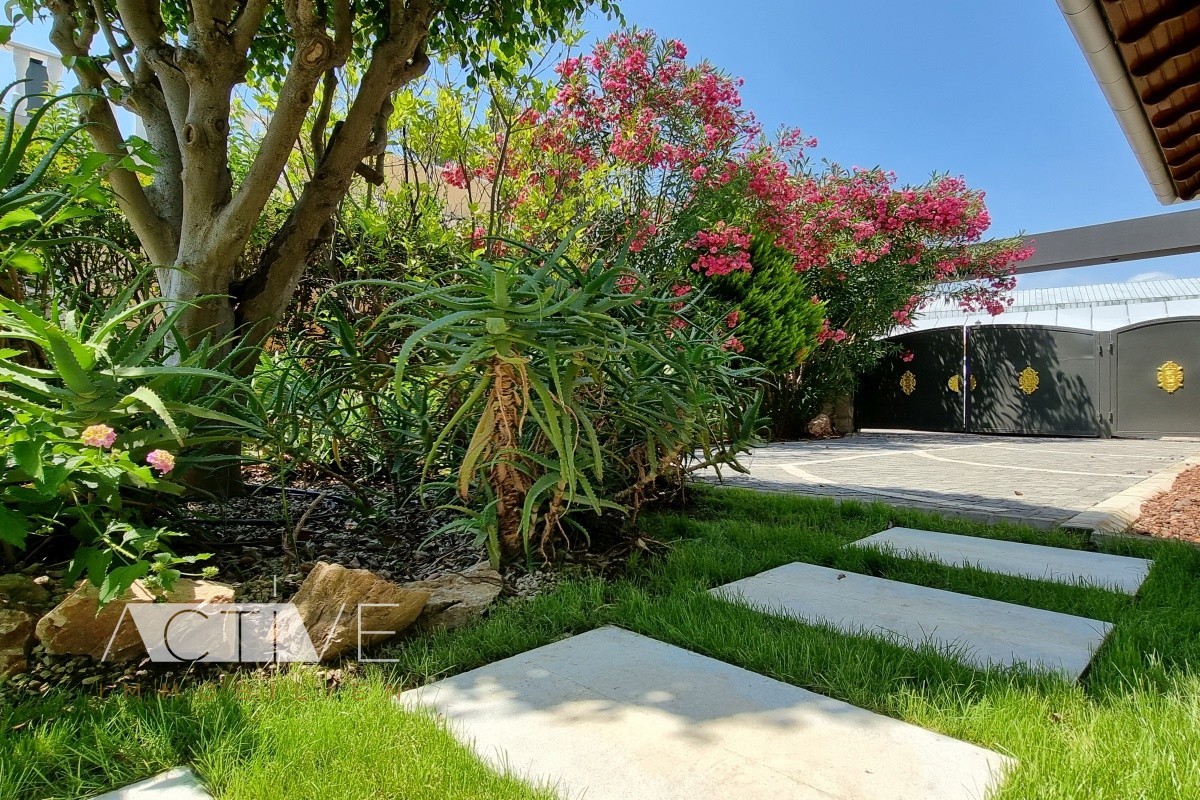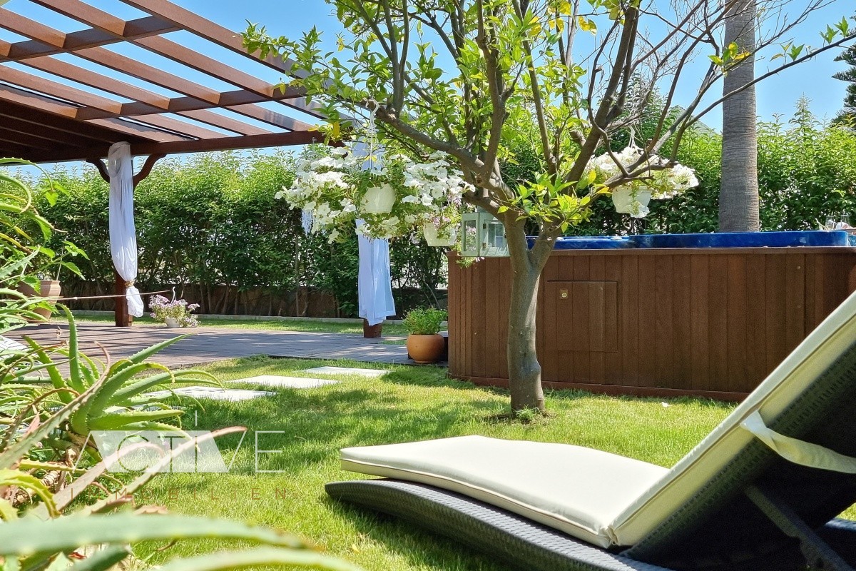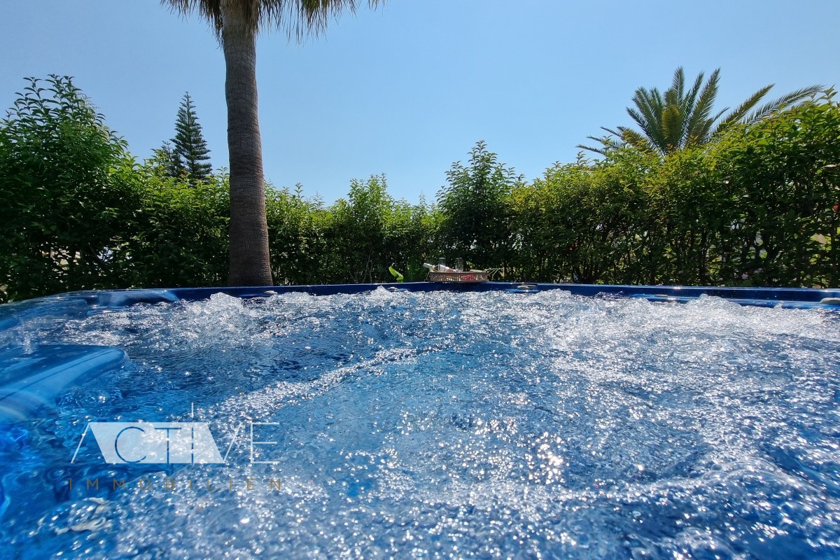 Genießen Sie den toll angelegten grünen Garten, mit den großen Palmen und diversen Obstbäumen. Entspannen Sie im eigenen Jakuzzi – eine harmonische Privatsphäre.