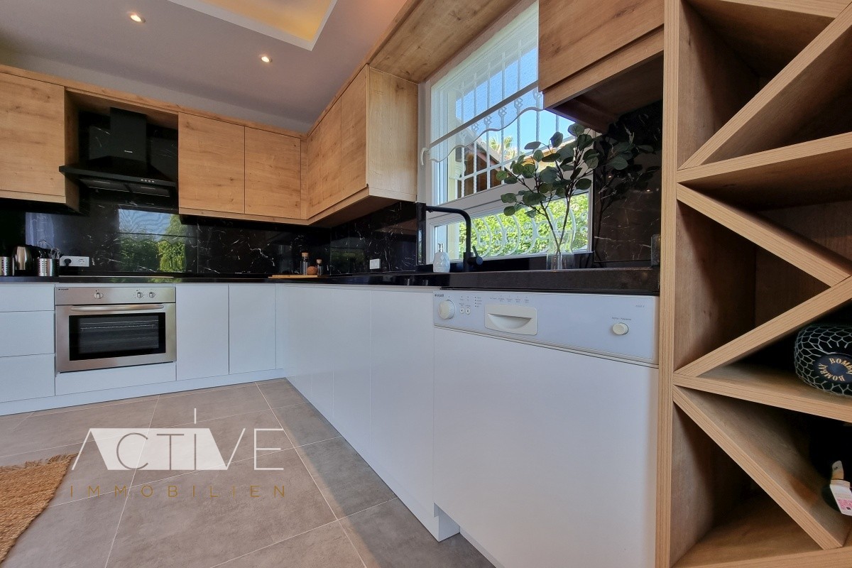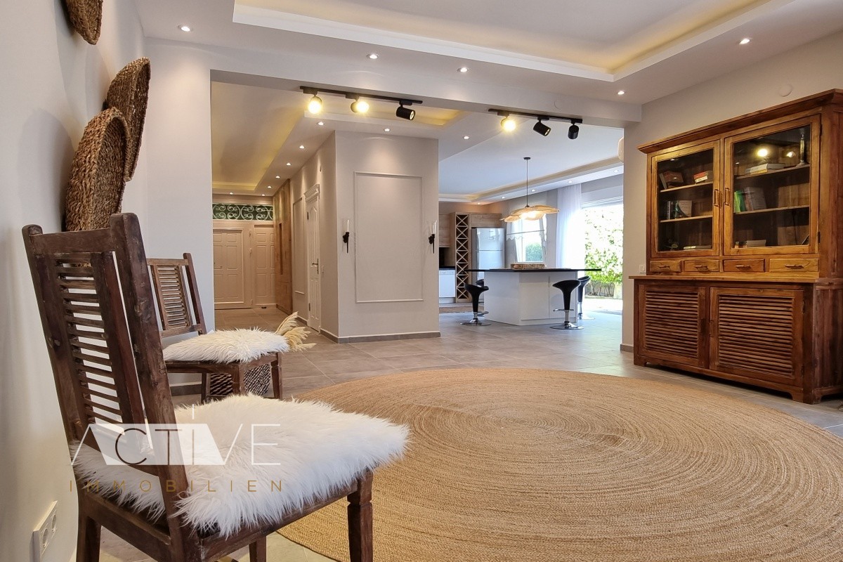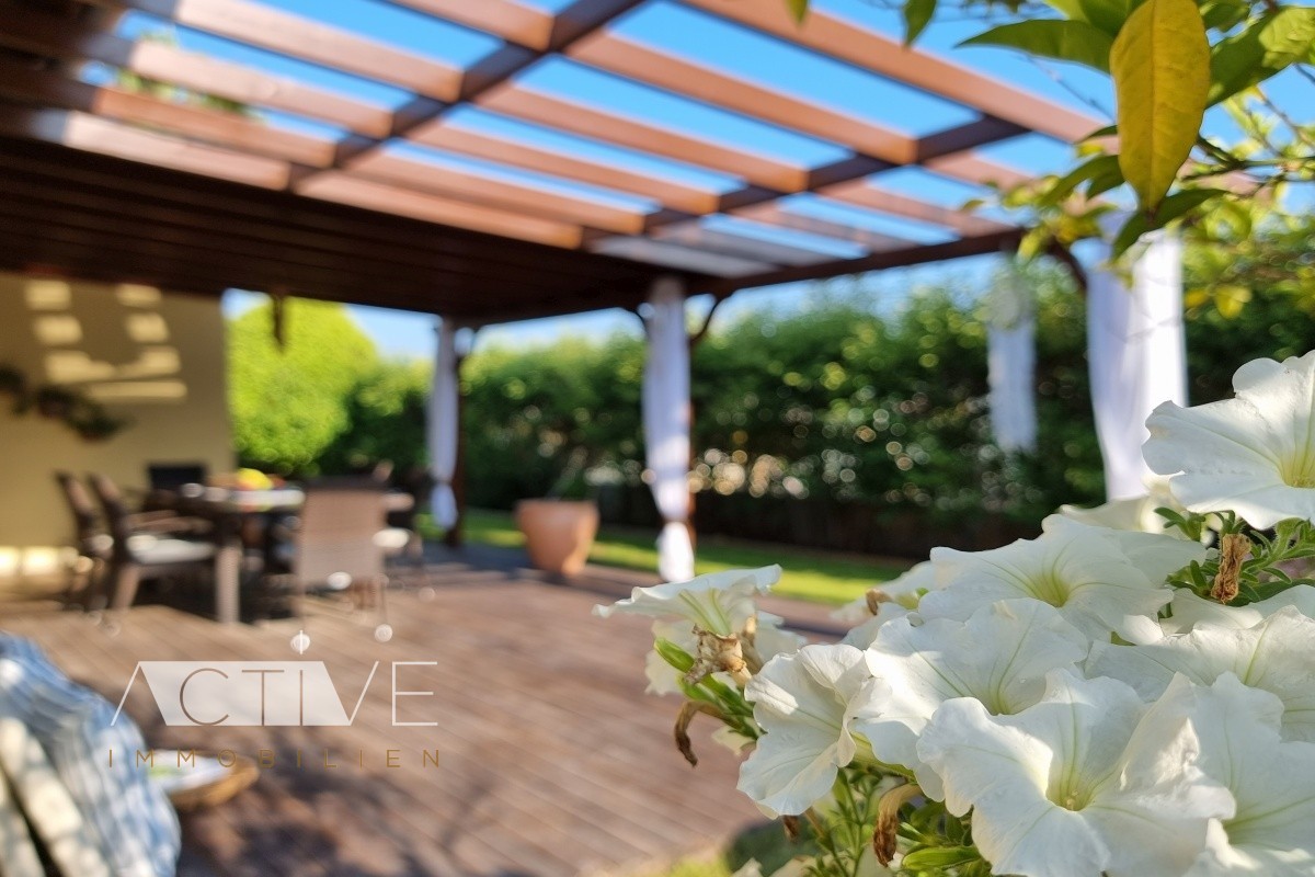 Im großen Gemeinschaftspool ziehen Sie Ihre Bahnen. Durch das Entree gelangen Sie in den großen Salon und die halb separate Küche mit Essbereich. Die Wände wurden aus sehr gut isolierenden Ytong erstellt und das Dach schützen hochwertige Brass-Ziegeln. Die Fußbodenheizung im ganzen Haus rundet die exklusive Ausstattung ab.