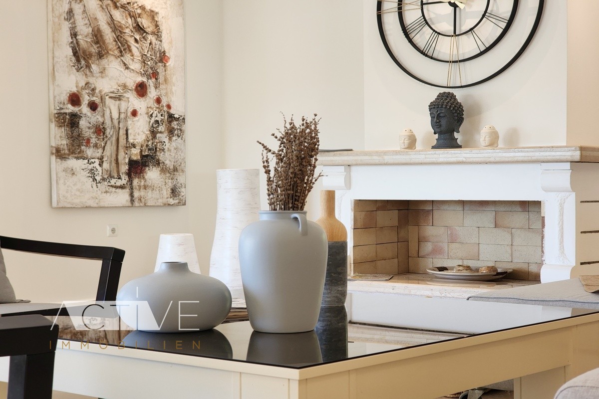 Die großen Räume sind Dank der hohen Fenstern lichtdurchflutet. Ein Kamin sorgt auch an den kühleren Wintertagen für eine gemütliche Atmosphäre und die Fußbodenheizung dient als zusätzliche Wärmequelle.