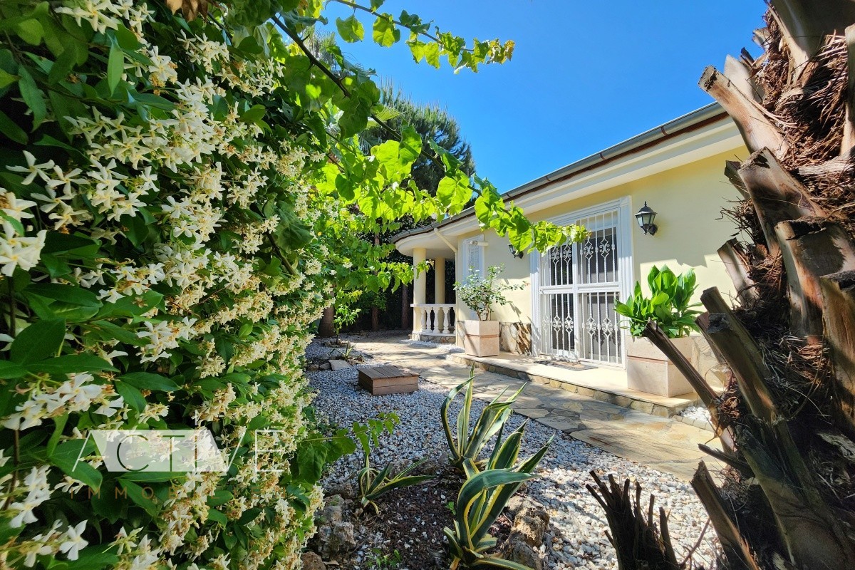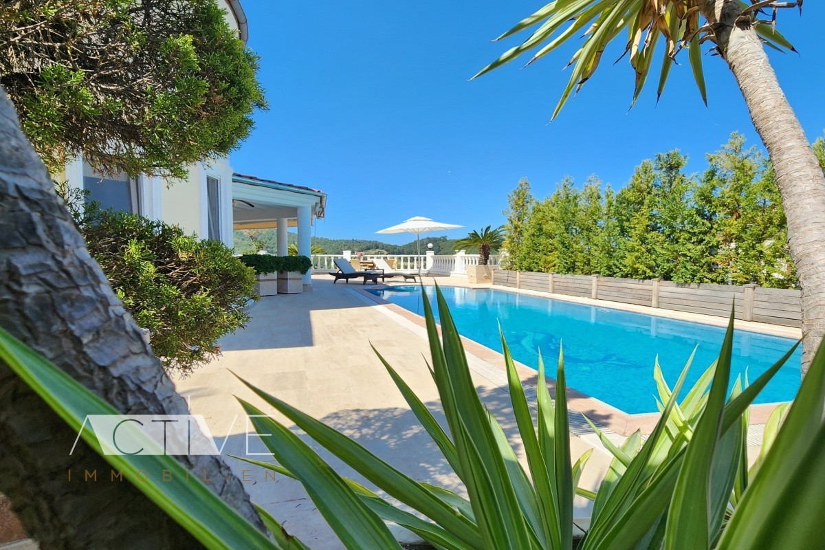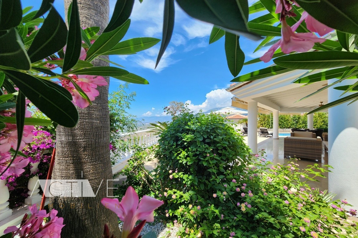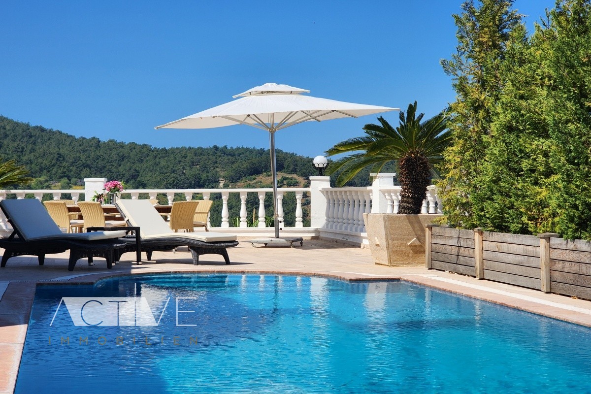 Von der großen Terrasse aus können Sie einen wunderschönen Panoramablick genießen, hier befindet sich auch der große, private Pool, der Ihnen in den Sommermonaten zur Abkühlung zur Verfügung steht. Sie parken Ihr Auto ebenerdig zum Eingang auf dem Grundstück, so daß Sie bequem Gepäck oder Einkäufe ins Haus bringen können. Zusätzlich finden Sie noch eine ins Grundstück integrierte Garage.