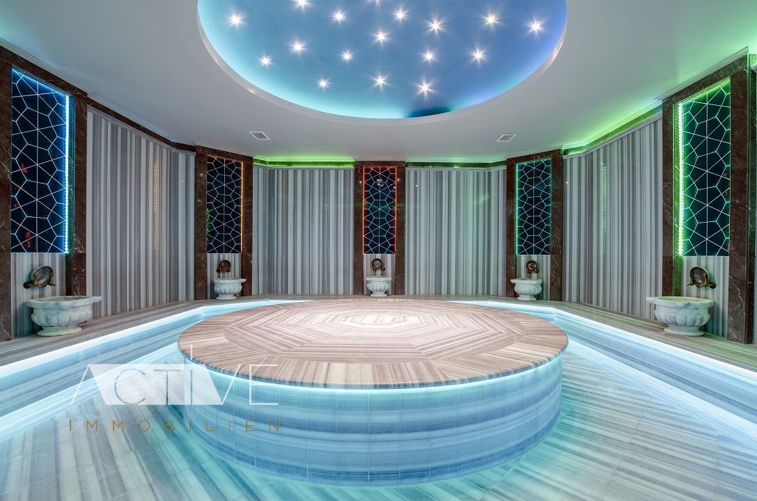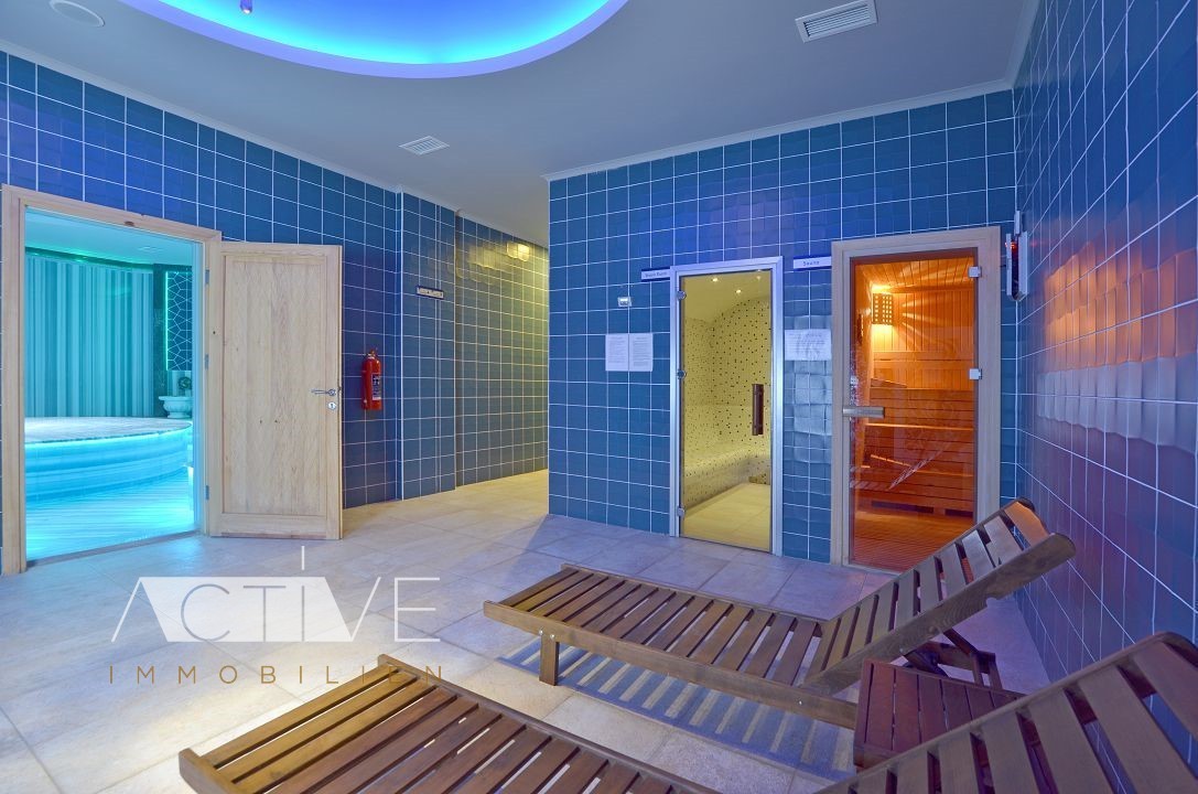 Rund ein Drittel vom gesamten Grundstück wurde mit schönen Grünanlagen angelegt, die sich perfekt in die Naturlandschaft eingebunden haben. In der Anlage finden Sie drei große Swimmingpools, zwei Rutschbahnen und ein Spa-Center mit beheiztem Hallenbad, Sauna, türkischem Bad, ein kleiner Supermarket, einem Fitnesscenter und Billiard vor.